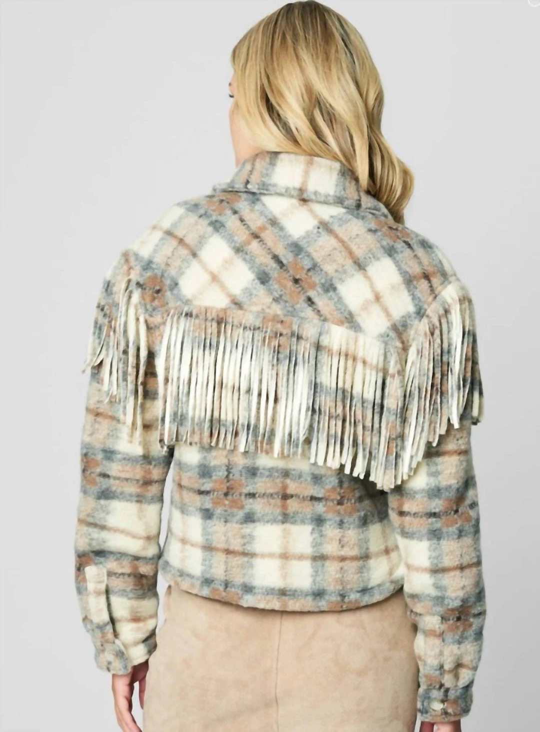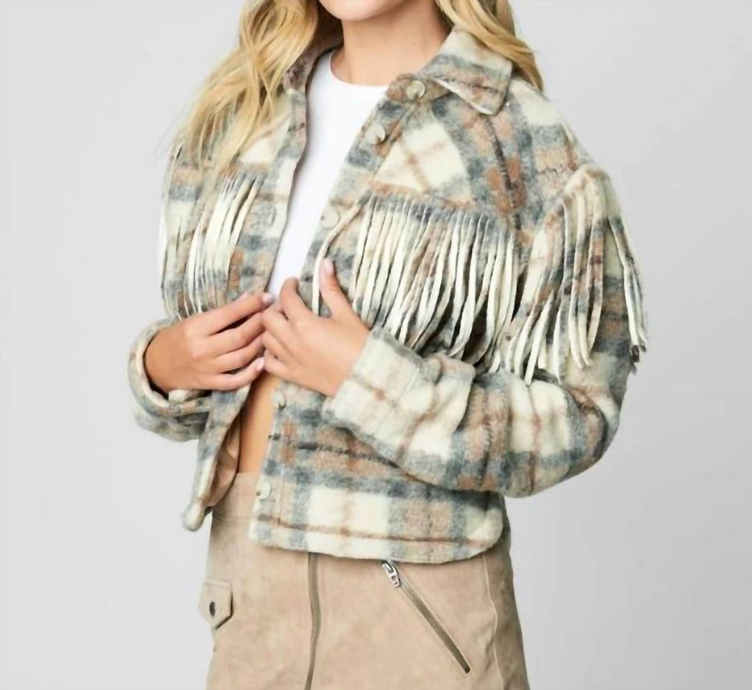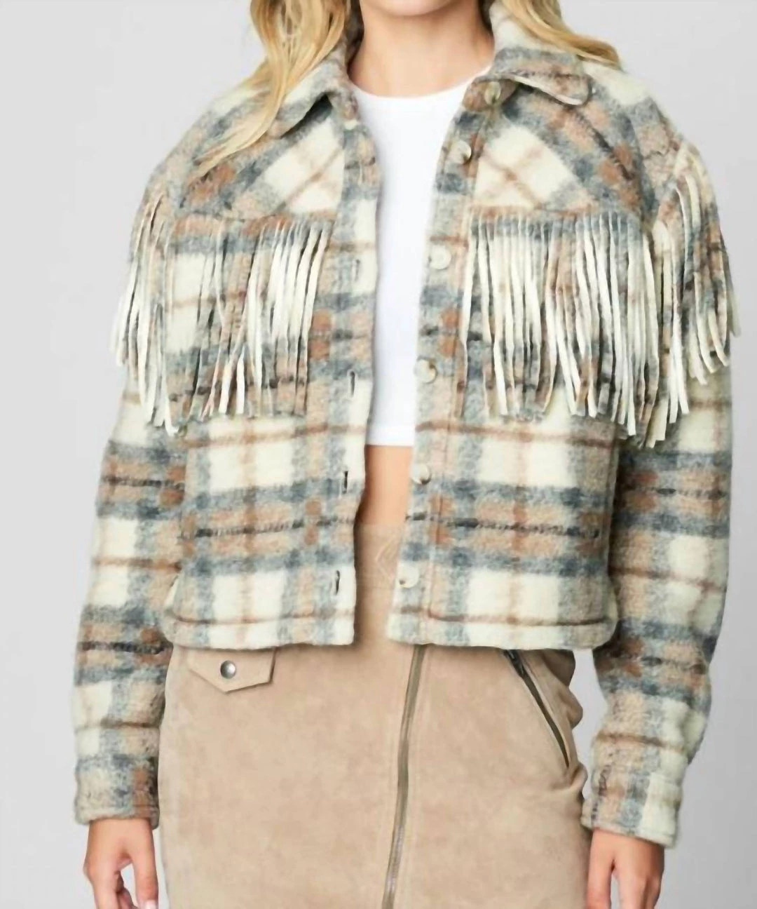 Bringing a touch of playful texture to your transitional wardrobe, this BLANKNYC jacket updates the of-the-moment shirt jacket silhouette with fuzzy felt, western-inspired fringe, and a cropped, boxy cut. Fits TTS