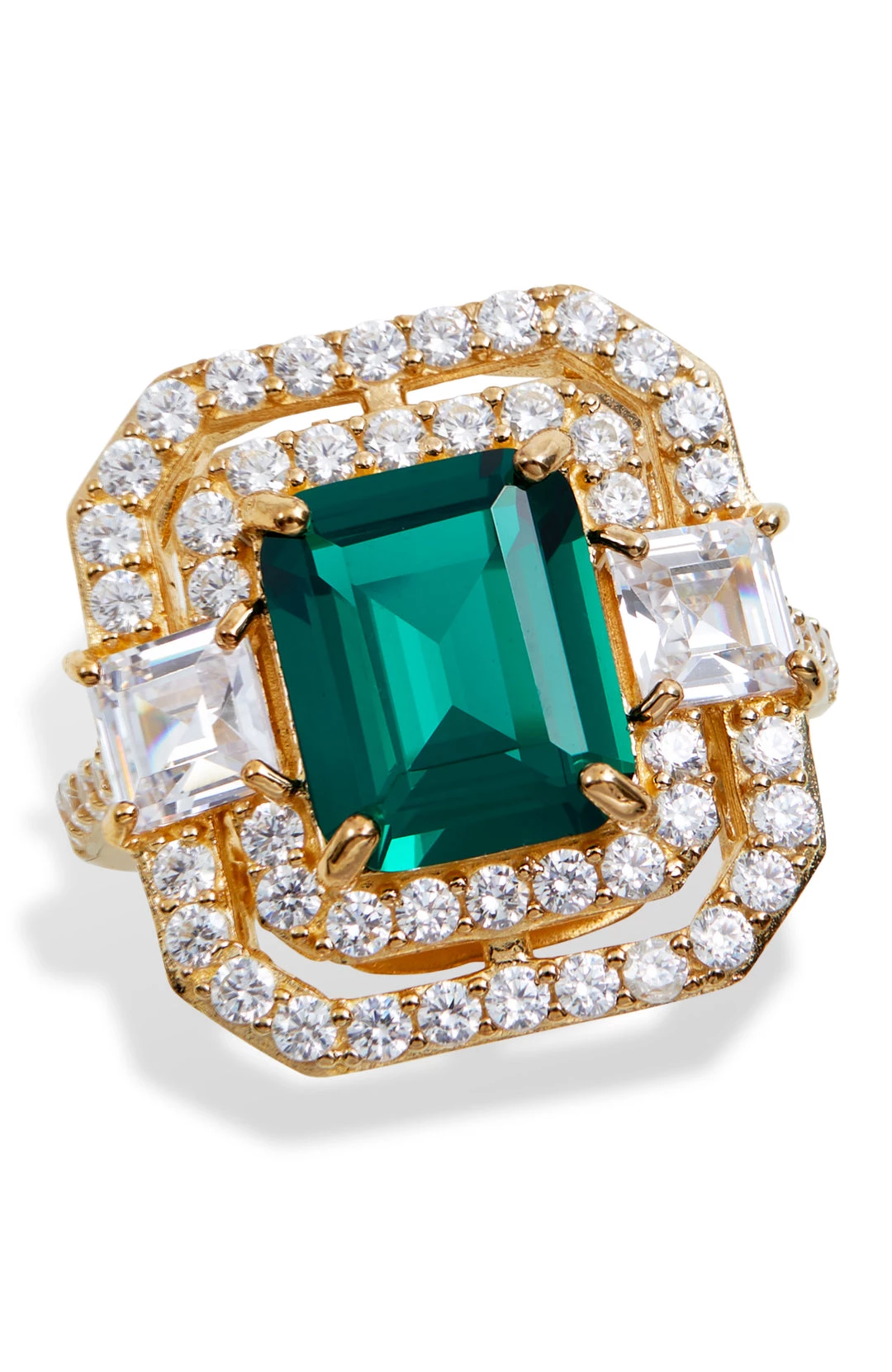 Big and Bold Statement Ring! One of a kind 18k Gold Vermeil Emerald Ring adorned with Cubic Zirconia stones. Perfect for date night! Details – Size 7