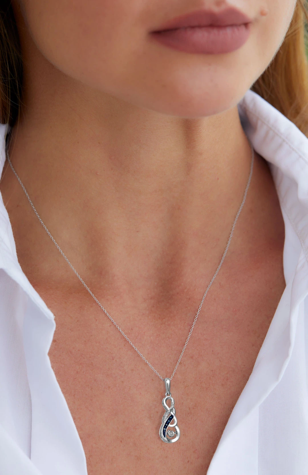Blue Diamond Sterling Silver Drop Necklace. Blue and white diamonds create a swirling pendant frame about a single dazzling diamond centerpiece on this necklace. Total Carat Weight 0.10