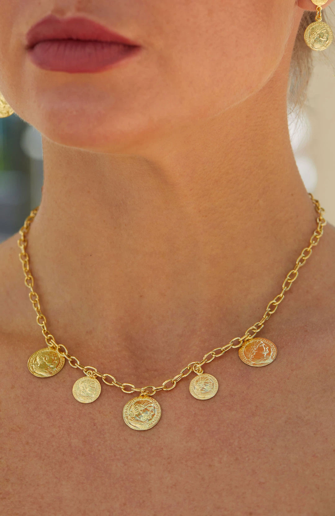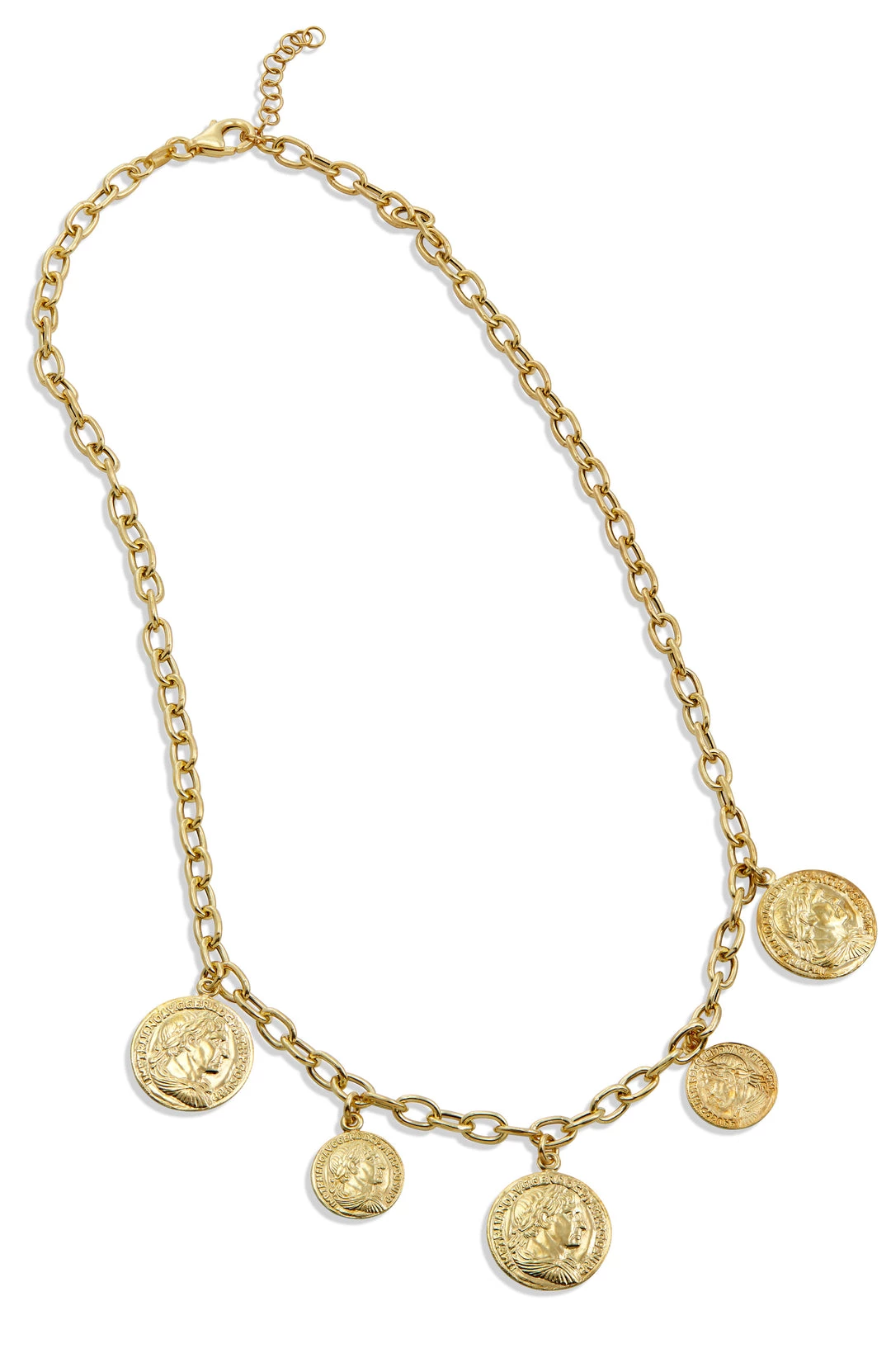 18K Italian Yellow Gold Vermeil Coin Charm Necklace. A lustrous Italian 18k yellow gold vermeil necklace suspends embossed coin charms for luxurious style. 18″ long