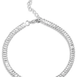 Rodium Plated Blaguette CZ Anklet. Sparkling baguette CZ stones compose a rhodium plated anklet for glamorous style. 9.5″ + 2″ extender-