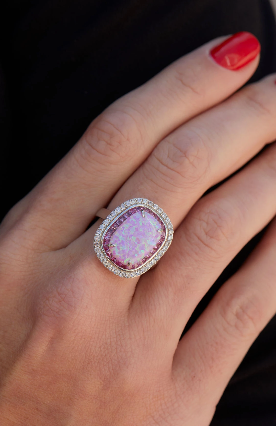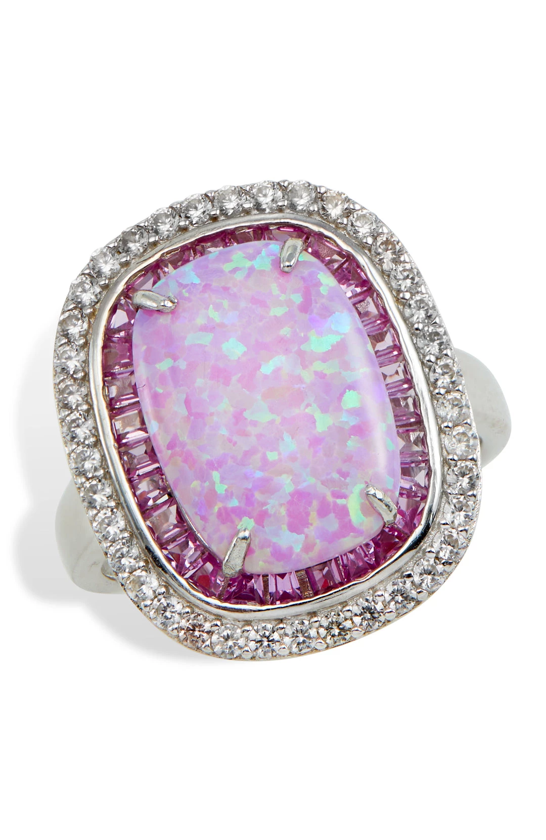 Sterling Silver Lab Created opal Halo Created Opal,pink sapphire and white zircon genuine stone ring . Sterling silver ring features a shimmering lab created opal Pendant with a pink sapphire and white zircon double halo for a beautiful sparkle!