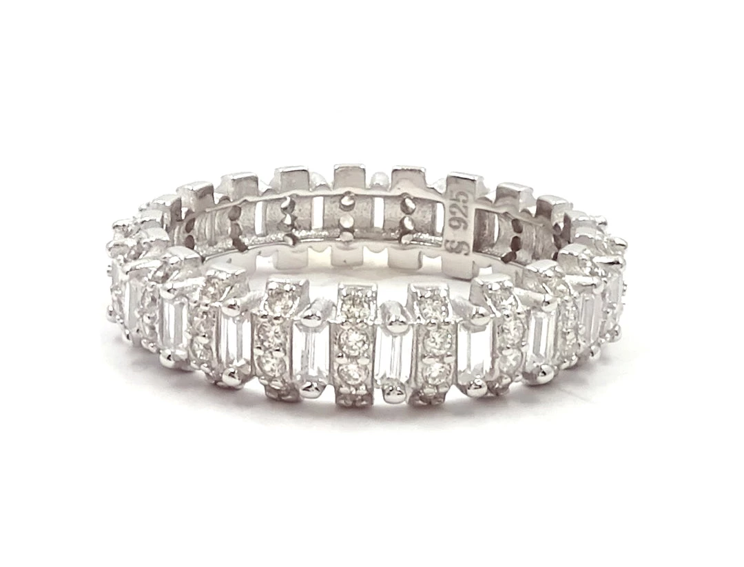 Sterling Silver, Cubic Zirconia 3.50TCW Eternity Ring. 360 degrees of sparkling, dazzling cut stones! This ring will add a classy, glamourous look to your everyday wear!