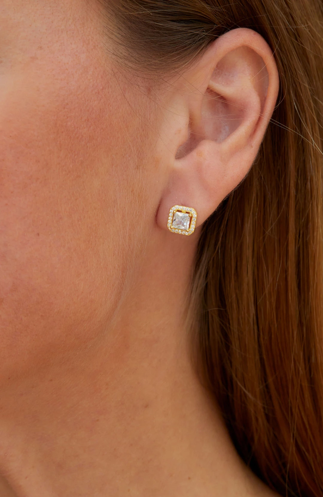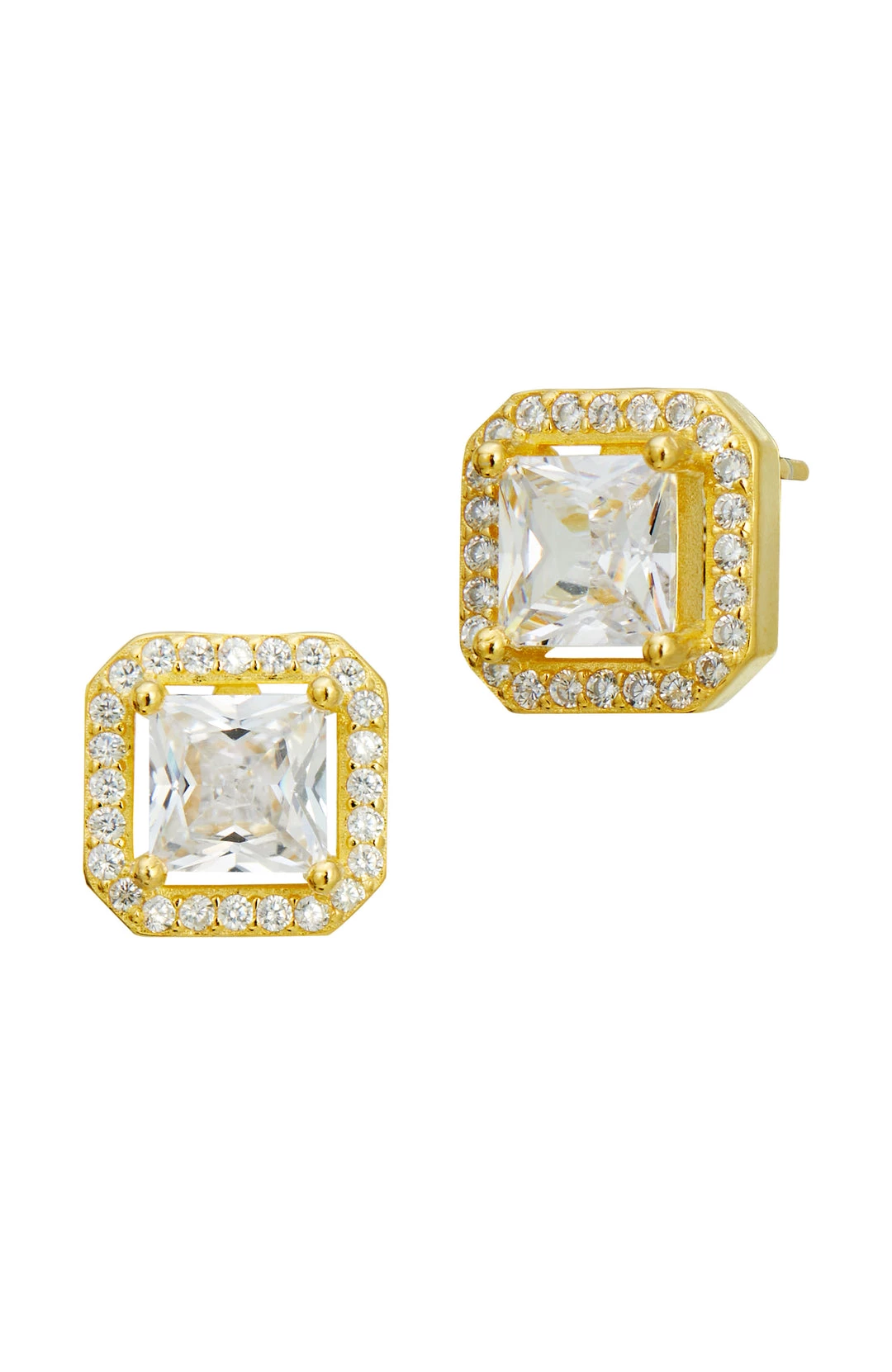 18K Gold Vermeil Asscher Cut CZ Halo Stud Earrings. Beautiful 18K gold vermeil stud earrings showcase asscher cut CZ stones with dainty halos for glamorous sparkle.