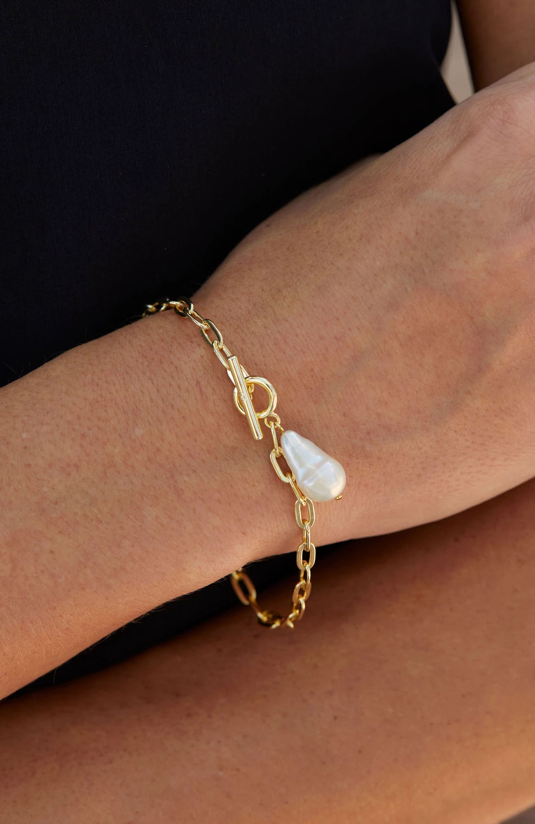 Vermeil Sterling Silver Baroque Pearl Toggle Bracelet. A genuine baroque pearl (approx 11mm x10mm) creates a unique pendant on this gold-tone sterling silver toggle bracelet.